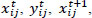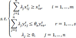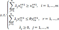 denote the ith input and rth output of the jth DMU at times t and t+1, respectively.