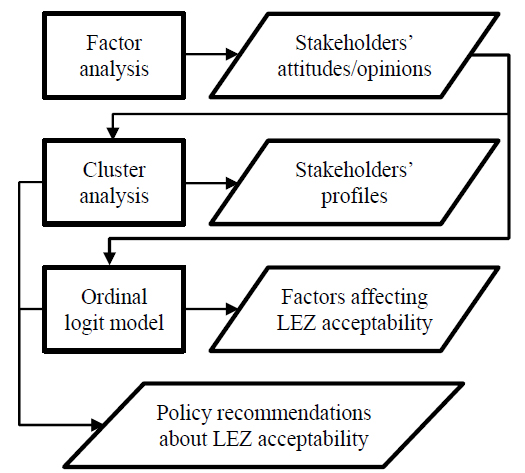 In order to obtain a comprehensive analysis of the factors that affect the acceptability of the new Low Emission Zone, an integrated analysis procedure based on three combined methods was developed and applied using data from the survey. The methodological framework is depicted in Fig. (2). Specifically, three statistical techniques were applied to achieve the following sub-targets, that contribute to reaching the global objective of the work. In particular, first, a factor analysis was implemented to identify potential correlation patterns among a subset of questions, thus highlighting a potential underlying structure of attitudes and opinions about the new LEZ [37-39]. Then, a cluster analysis was used to define profiles of stakeholders, considering their attitude toward the new measure [39, 40]. After that, due to the ordinal nature of answers related to the acceptability level of the LEZ, an ordinal logit model was developed to understand factors affecting the possible support of the new regulation [30, 41, 42]. In particular, the three methods were selected for the following reasons. The factor analysis could allow to create significant and synthesized latent factors describing perceived positive and negative impacts of the new LEZ. The clustering approach could lead to the identification and charac- terization of LEZ supporters and opposers. The ordinal logit model could highlight the causal relationship among the characteristics and opinions of stakeholders and their acceptability level toward the measure. The combined application of the three methods can provide an in-depth analysis of the drivers of LEZ acceptability, to understand how the measure can receive effective support from stakeholders.