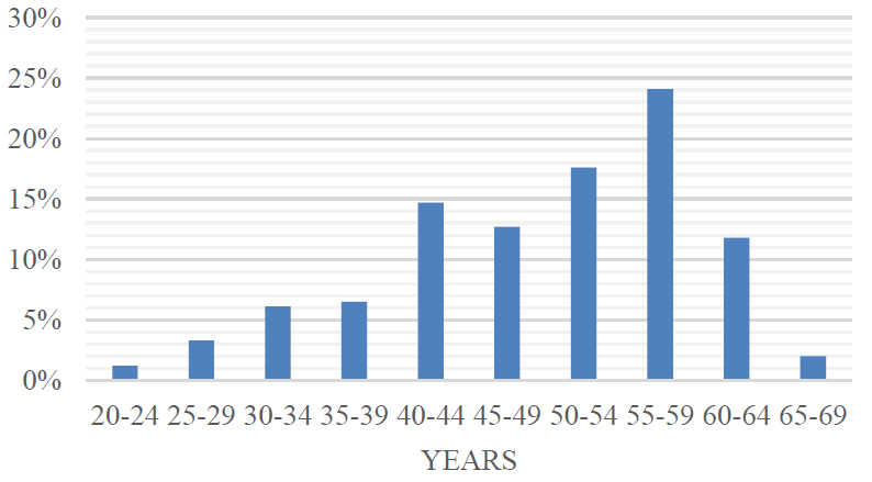 The descriptive statistics of the sample of respondents are summarized in Figs. (3-7) and further details can be found in [33]. By observing the figures one can note that female participants represent about 60% of the total sample (Fig. 3), and about 80% of the individuals are aged 40 to 64 years (Fig. 4). Although this range is mainly related to working people, registered purposes to access the area are equally distributed, highlighting that the survey effectively targeted a wide range of stakeholders (Fig. 5). With respect to the frequency of entering the area (Fig. 6), different values were observed; moreover, the figure confirms that stakeholders actually affected by the LEZ were targeted, since the number of people reporting they never access the area is null. As regards the cross-relationship between travel modes to enter the area and access purposes, Fig. (5) shows that private car and bike are mainly adopted for work purposes. Concerning attitude toward the potential Low Emission Zone and its impacts (Fig. 7), about 68% of respondents stated that they are willing to accept the new regulation, suggesting that the measure could be supported by many persons.