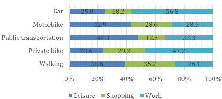 Percentage distribution of access purpose for the adopted travel modes.