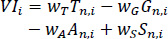 The Vulnerability Index (VI) for each isodistance i (and, consequently, for each school) is given by a linear combination of the different normalized criteria j, each weighted by wj, the specific weights assigned to each criterion. These weights are determined through a participatory procedure involving stakeholders and other relevant actors. VI is computed according to the following equation: