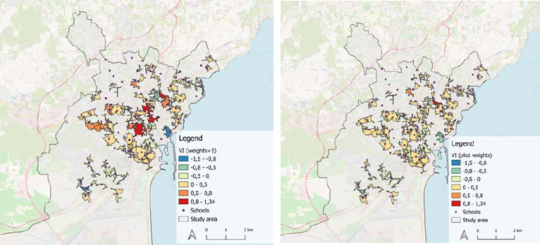 In general, isodistances presenting negative values of VI can be considered with low vulnerability, while those with positive values of VI indicate areas with high critical issues; the higher the VI, the greater the vulnerability of the facility. Observing the two maps of Fig. (2) one can notice that most of the schools exhibit vulnerabilities. Specifically, Fig. (2a) shows that the most vulnerable facilities are those located in the city center, whereas schools with the least critical issues are located in the southeast and southwest of the city. The application of the weights narrows the gap between the scores obtained by the schools, allowing some of the facilities to emerge in comparison to others. As can be noticed in Fig. ( 2b), there is one “red” school with a higher value of VI, which is a secondary school located in a single-lane single-direction street with parking lots at both sides, poor pedestrian infrastructures, and high traffic volumes. Other schools in the same area face similar challenges. The incorporation of stakeholder-derived weights significantly influenced the outcomes of the VI computation, highlighting the importance of accounting for community perspectives in the decision-making process, one of the pillars of the BEC2SCHOOL project. However, it is important to highlight that stakeholder engagement is resource-intensive; in our pilot, the relatively small number of participants—16 high school students—may have introduced biases that could affect the generalizability of the results. Expanding participation to include diverse groups, such as parents, teachers, and local residents, would likely provide a more comprehensive view of priorities. However, these preliminary results can be helpful in making a preliminary assessment of the areas and facilities where it is necessary to intervene and represent the first step to identifying priority schools where to install sensors and start co-creation processes. Other analyses should be performed to understand the willingness of schools, residents and other stakeholders to be involved in co-creation processes.