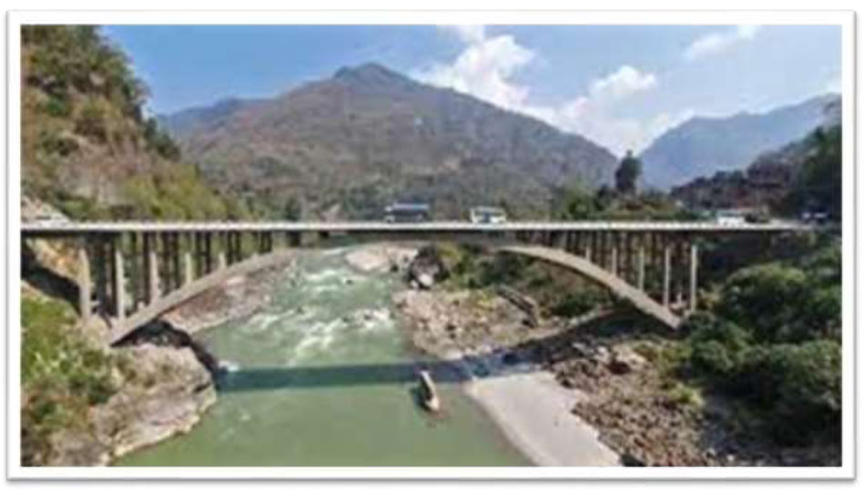 The construction of national highways in Nepal began in 1956, with the first one connecting the Indian border to the capital city, Kathmandu. In 1971, the Siddhartha Highway was built, linking the Indian border to Pokhara. Along this highway, the first prestressed bridge was constructed over the Jhumsa Khola. A notable milestone was achieved in 1993 with the construction of the first cable-stayed bridge across the Karnali River [22]. Additionally, the history of modern suspension bridges in Nepal dates back to 1900, when the first one was built across the Trishuli River [23]. Notably, a concrete arch bridge was constructed over the Bhote Koshi River at Kodari, on the Chinese border, in 1965 [24].