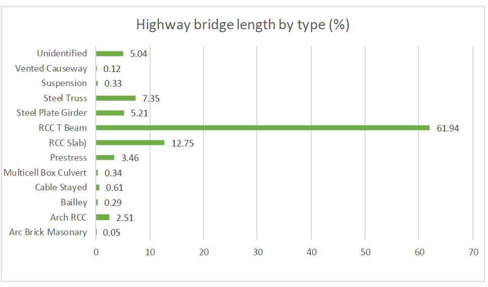 About 85% of highway bridges are concrete bridges. RCC T-beam bridges are the most common type in the country. The number of prestressed T-girder and box girder bridges is also increasing. The percentage distribution of bridge length is provided above in Fig. (6).
