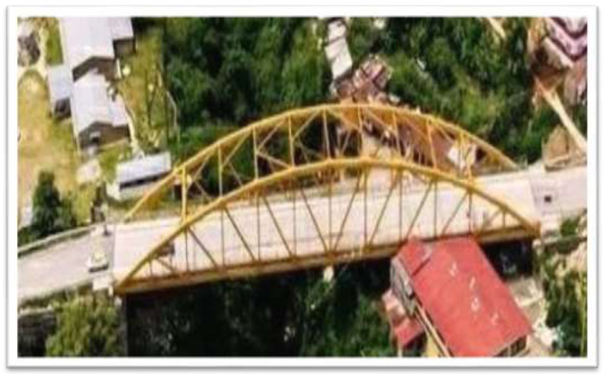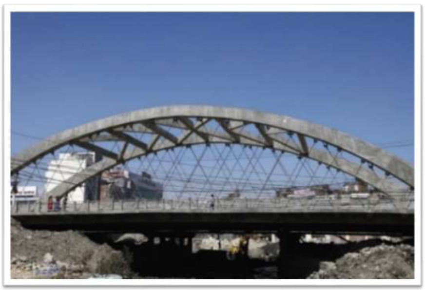 Deck Arch Bridge A deck arch bridge has its deck located above the crown of the arch, which is the typical design for a true arch bridge. This is the most common type of arch bridge, ideal for crossing valleys with stable rock walls. The Sino-Nepal Friendship Bridge over the Bhotekoshi River, which links Kodari in Nepal with Zhangmu (Khasa Bazar) in China, is an example of a deck arch bridge (Fig. 10). It is a reinforced arch bridge with a prestressed concrete deck girder on top. The bridge is 45 meters long and 8 meters wide and was built in 1964. However, it was severely damaged by the 2015 earthquake and has since been replaced by a beam-type bridge. The Mugling Arch Bridge over the Trishuli River on the Prithvi Highway is the longest deck arch bridge in Nepal completed in 2019, it was built by a Nepali contractor under a design-and-build model. The bridge has a total length of 160 meters, with a 120-meter arch span and two 20-meter side spans. The arch rise is 16.28 meters, resulting in a span-to-rise ratio of 7.37. The arch rib is 1.0 meters wide and 2 meters deep, while the bridge itself is 10.6 meters wide. The construction cost, including PS and VAT, was NRS 103,860,000 [39]. A photo of the Mugling Arch Bridge is shown below in Fig. (11). This bridge is a landmark structure with the longest concrete deck span of 120 meters in South Asia. The Kochalighat Kuine Bridge on the Chisapani-Babiyachaur-Badichaur-Surkhet Road is a three-span continuous open spandrel concrete deck arch bridge completed in 2023. The bridge has a total length of 300 meters, with arch spans of 87.40 meters, 99.10 meters, and 100.10 meters. The arch rise for the second span is 18.20 meters, giving it a span-to-rise ratio of 5.5. The bridge features three arch ribs, each with a width of 0.9 meters and a depth of 1.50 meters. It has a pile foundation at the right arch block and an open foundation on a rock at the left arch block. The bridge is 11.00 meters wide and was constructed at a cost of NRS 339,661,000, including PS and VAT [40]. A photo of the Kochalighat Kuine Bridge is shown below in Fig. (12).