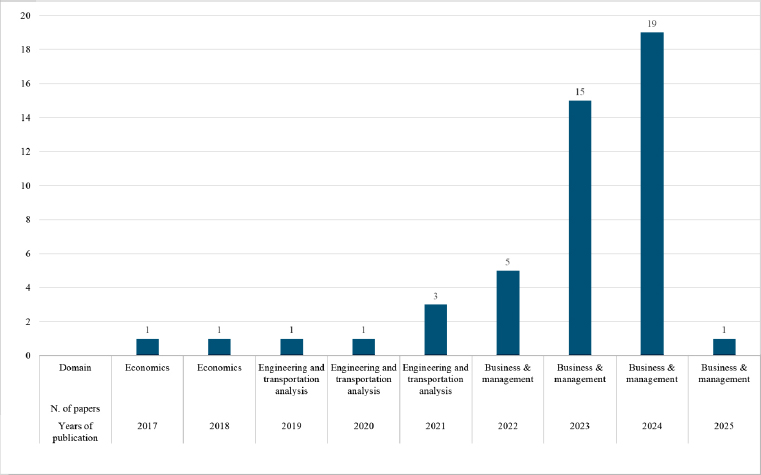 Fig. (2) illustrates the distribution of publications across different domains. Between 2017 and 2020, output was minimal, with only one paper per year, primarily in economics and engineering, and transportation analysis. A notable upward trend has been observed in 2021, reaching three publications, followed by a further rise to five publications in 2022.
