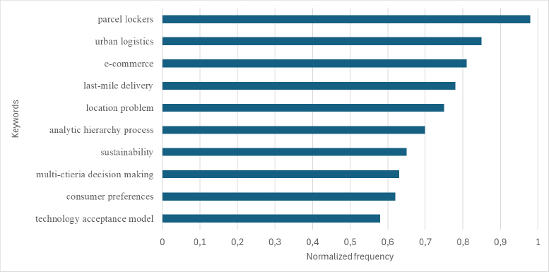 Fig. (3) describes the common keywords that emerged. It highlights the prominence of key themes in the last-mile delivery research. “Parcel lockers” and “last-mile logistics” dominate, reflecting their central role in optimising urban logistics and e-commerce efficiency. Keywords like “innovation” and “sustainability” emphasize the growing focus on technological advancements and environmental concerns in delivery solutions.