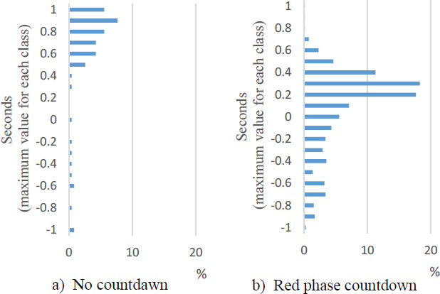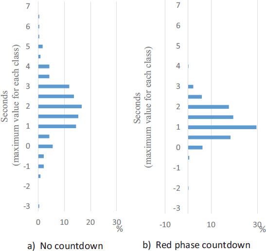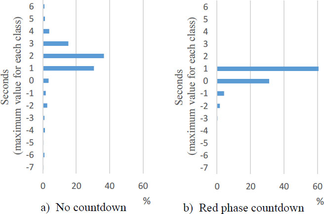 Our previous study (Tomomatsu et al. [1]) showed that countdown information reduces the intensity of ER but increases its rate. From our subsequent research, it was found that this phenomenon can be attributed to the microscopic startup behavior within 1 s before the signal switches from red to green and the accelerating behavior within a range of 1 m from the stop position of a vehicle.