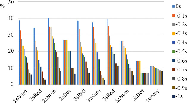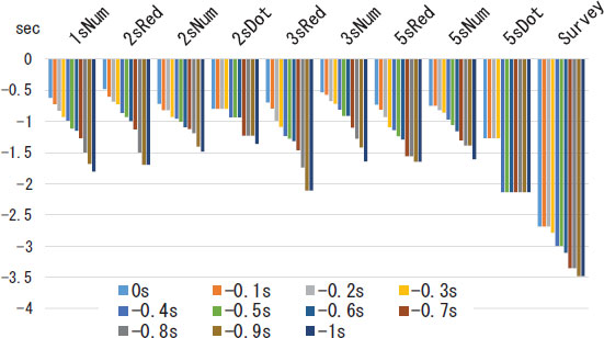 From the above results, 2sRed, 5sRed, and 5sNum are better when the safety at ER and the smoothness of non- ER are considered, although there is a slight difference between the forms. Moreover, when the countdown is displayed, in dot signal form, the nearest scale line arrival time is slightly large, and the characteristic at ER is similar to that in NC.