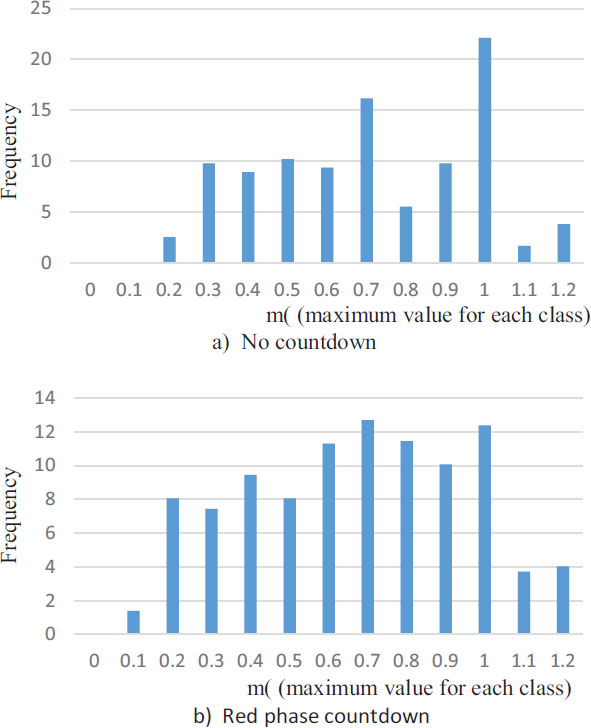 Based on SRT of the first vehicle, the ease of grasping the start timing by the countdown is analyzed, considering the microscopic behavior 1 s before the signal switches to green. Fig. (9) shows the frequency distribution of SRT of the first vehicle based on the data of the 646 cases in the RC experiments and 132 cases in NC surveys described in Chapter 3. A large startup delay and large ER of −5 to −6 s were observed in the case of NC but not in RC. Thus, by displaying the countdown, variations in start timing and large ER can be suppressed.