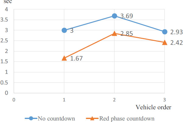 As shown in Fig. (16), by displaying the countdown, not only the lead vehicle but also the second and subsequent vehicles start faster. However, since the difference in the head time between RC and NC decreases as the car is behind, the head time of the third and subsequent vehicles in a signal queue converges to the same value regardless of NC or RC. Based on the results, analyzing the outflow times up to the third vehicle is effective in comparing the number of vehicles that can be handled by one green light.