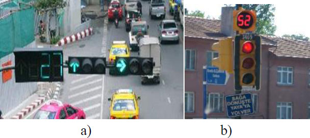 Next, we review the impacts of vehicle countdown traffic lights on vehicle behavior at actual signalized intersections. Vehicle countdown is always provided in a numerical form. As shown in Fig. (2a), it is displayed in a square (hereafter, number type/large size) more than twice as large as the signal lamp. In Fig. (2b) a little larger than the signal lamp, and it is a circle (or a square) display (hereafter, number type/medium size). In the following section, we describe the forms of countdown displays in detail. Vehicle countdown traffic lights have been evaluated differently using green-signal countdown devices (GSCDs) and red-signal countdown devices (RSCDs).