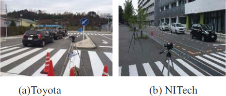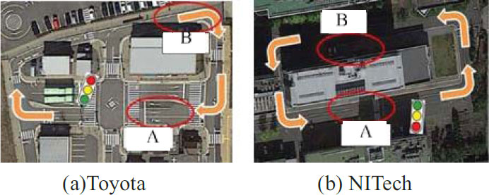 Since countdown traffic lights are not yet used on roads in Japan, we conducted experiments using two simulated roads with traffic lights and the countdown information developed in our laboratory (Fig. 4) [19]. The experiments were conducted for four days at the Toyota Safety Drive Learning Center (Toyota) on December 14, 22, and 24, 2015, and at Nagoya Institute of Technology (NITech) on July 15, 2017. The experimental courses are shown in Fig. (5), and the experimental conditions are shown in Fig. (6). In both experiments, the countdown traffic light was installed at a position approximately 30 m ahead of the stop line, in the front right direction in the traveling direction of the experimental vehicle, and the height of the signal lamp was approximately 2 m. The total number of subjects in the entire experiment was 51 (28 males and 23 females): 16 in their 20s, 18 in their 30-40s, 15 in their 50-60s, and 2 in their 70s or older.