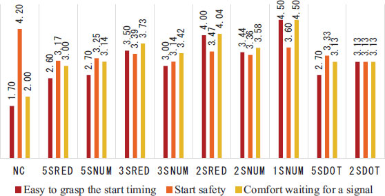 For “start safety” in the questionnaire, NC showed the highest points of 4.2, followed by 1sNum and 2sRed with approximately 3.5 points. The rates of NC and 5sDot in the “ER rate” and “PS rate” for both threshold values are very small, and the rankings are very high. However, in the “Average ER time,” NC and 5sDts have considerably lower values (−2.58 s or less), and the ranking is exactly the opposite. Next, considering the “comfort waiting for a signal” and “easy to grasp the start timing” in the questionnaire, 1sNum showed the highest points of 4.5, followed by 2sRed, 3sRed, and 2sNum (3.5 points), but NC was poorly evaluated with an average score of 2 or less.